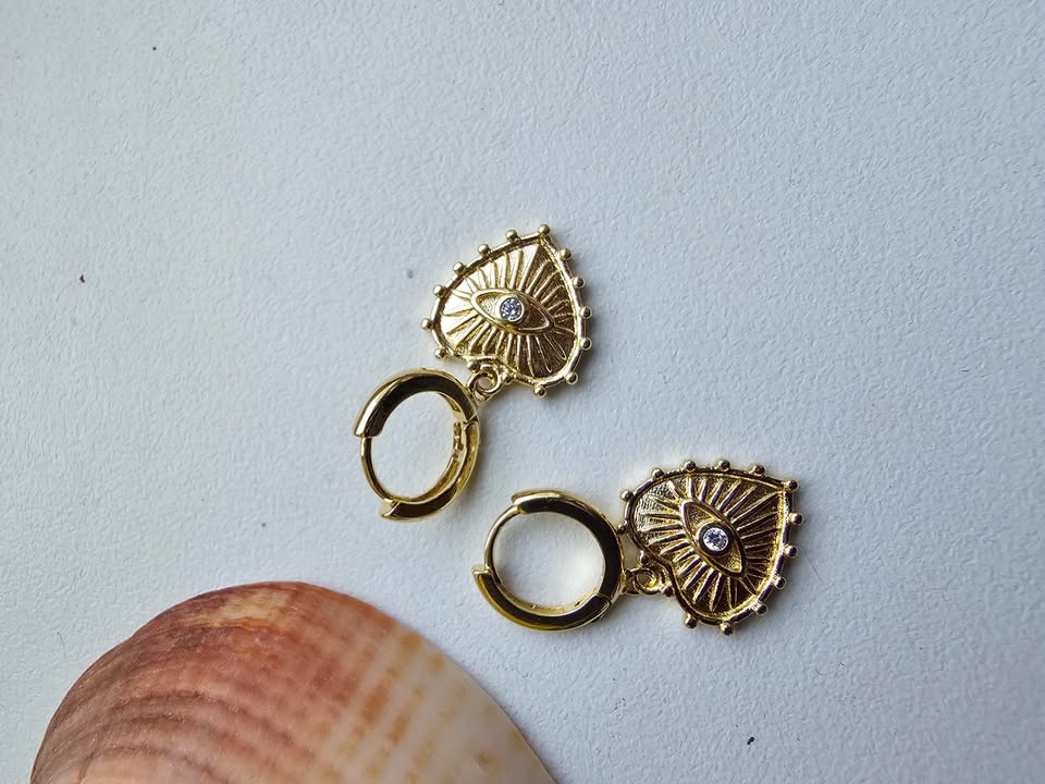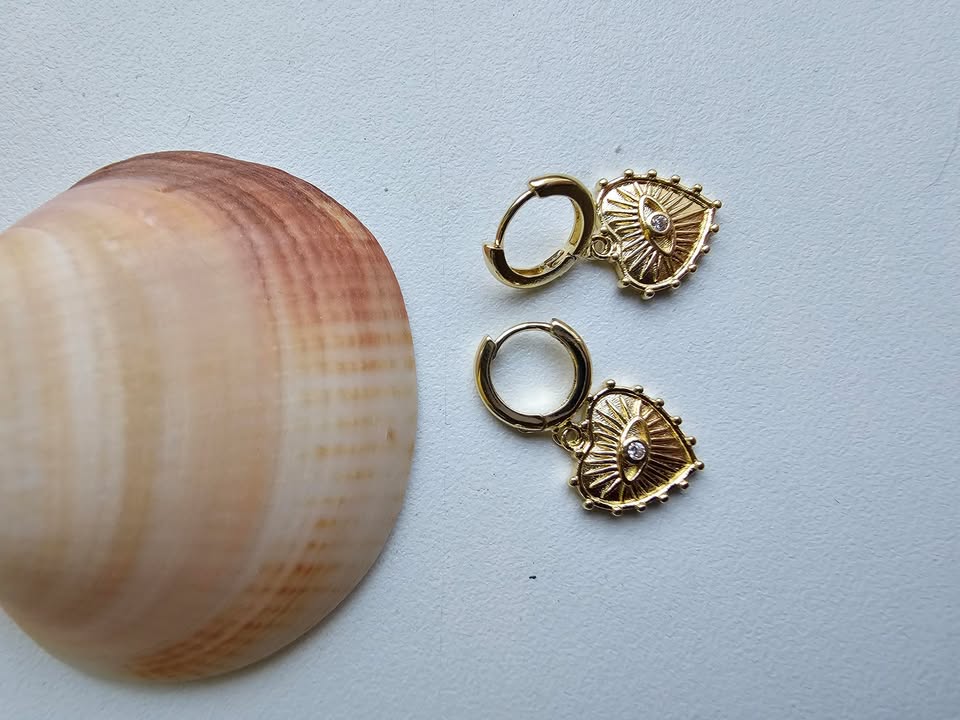 Įsileiskite į savo stilių subtilią paslaptį ir simbolikos gylį su šiais kabantys auskarais širdelės formos su auksine akimi. Širdelė – meilės, šilumos ir moteriškos energijos simbolis, o akis – senovinis apsaugos talismanas, saugantis nuo negatyvios energijos ir pritraukiantis gerąją jėgą. Kartu jie sukuria harmoniją tarp jausmo ir stiprybės, subtiliai primindami apie vidinę galią, pasitikėjimą ir moterišką žavesį.