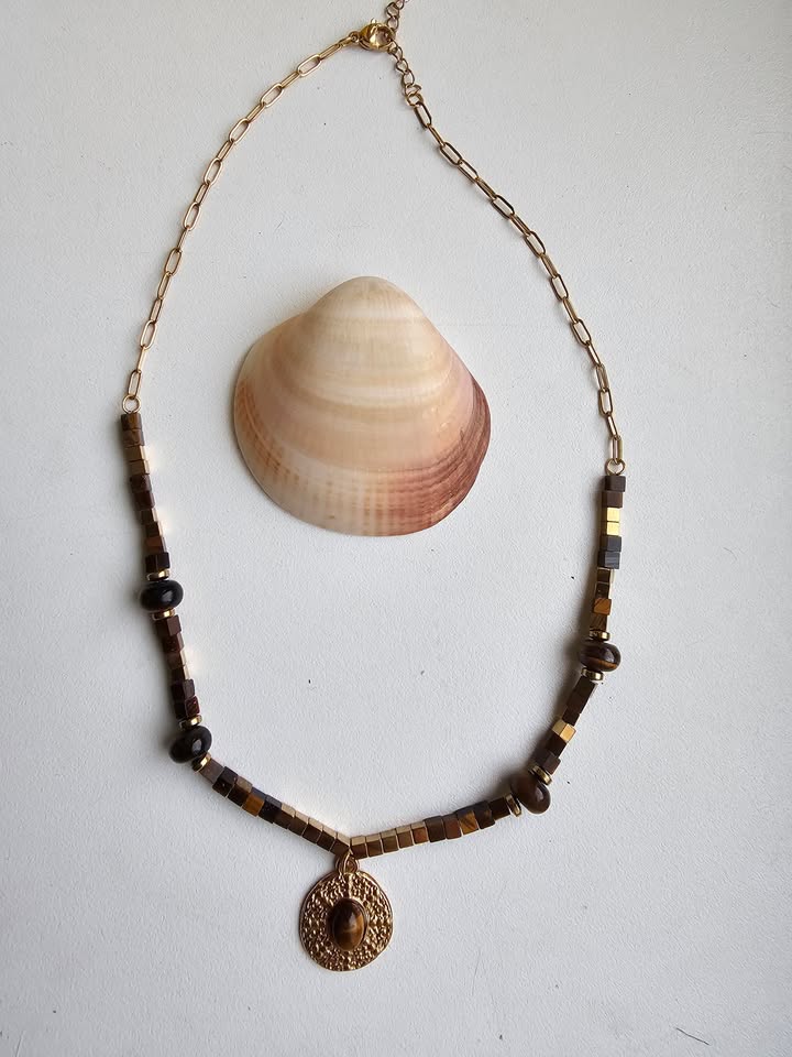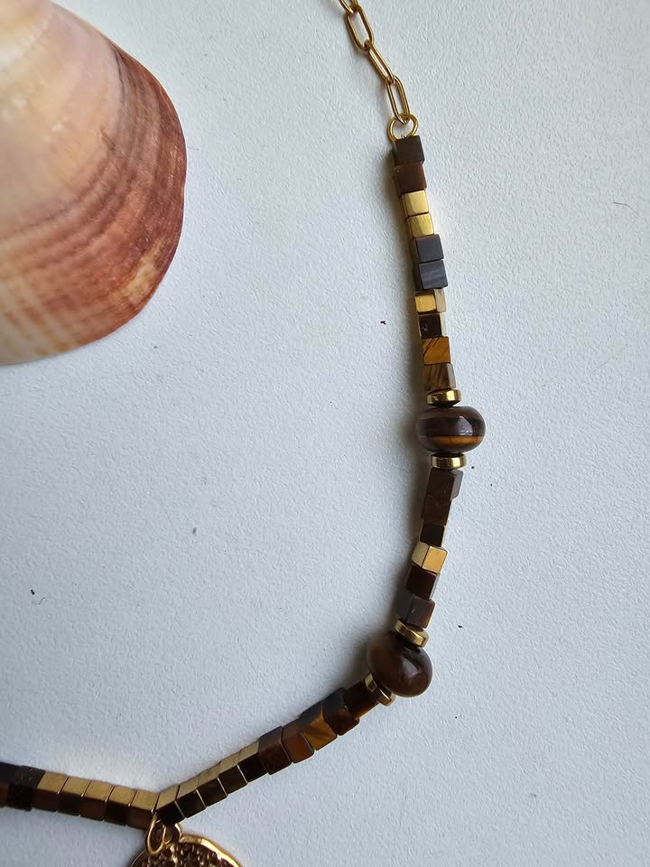 Atraskite jėgą, užsidegimą ir pasitikėjimą savimi su šiuo išskirtiniu Tigro Akies vėriniu, papuoštu elegantiškais aukso spalvos karoliukais. Tai ne tik papuošalas — tai energijos šaltinis, skirtas moteriai, kuri žengia per gyvenimą drąsiai, tvirtai ir išdidžiai.