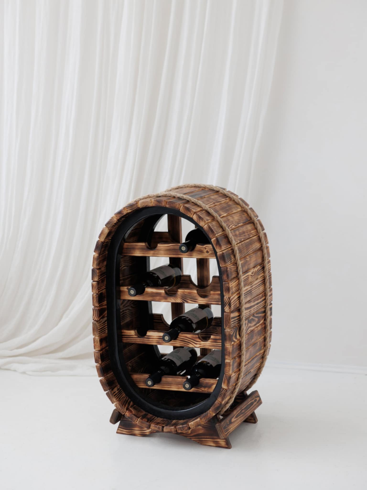 Pagaminta iš aukštos kokybės medienos, vyninė gali būti pritaikyta pagal jūsų pageidavimus – galima rinktis norimą spalvą, medienos tipą ar apdailos toną. Ovalo formos konstrukcija su subtiliais rėmo elementais primena senovinę vyno statinę, tačiau išlaiko šiuolaikinį rafinuotumą.