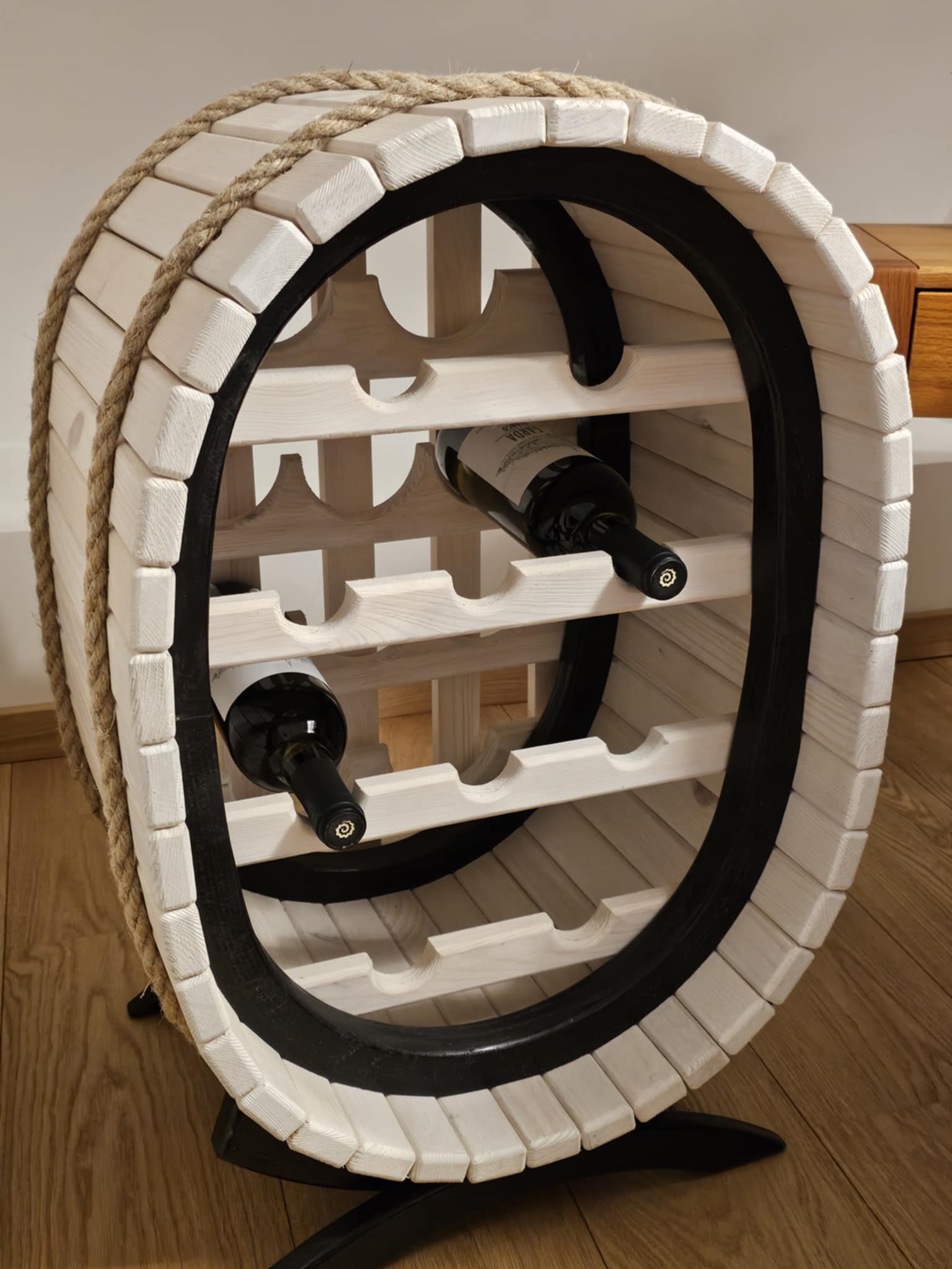 Ši prabangi, meistriškai sukurta rankų darbo vyninė–bačkutė (Mažoji vyninė aukštis 73 cm, plotis- 44 cm)– ne tik praktiškas, bet ir itin estetiškas interjero akcentas. Kiekviena detalė išdirbta su meile ir kruopštumu, todėl šis baldas spinduliuoja išskirtinį dizaino pojūtį bei jaukumą.